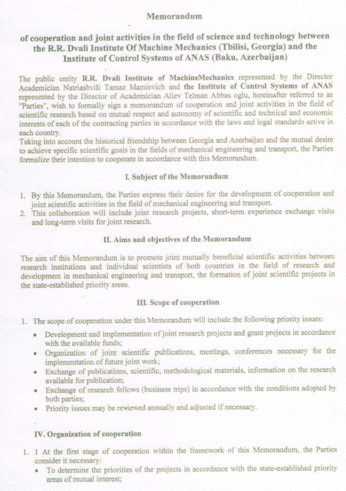 Memorandum of cooperation and joint activities in the field of science and technology between the R.R. Dvali Institute of Machine Mechanics (Tbilisi, Georgia) and the Institute of Control Systems of ANAS (Baku, Azerbaijan) was signed on 14.11.2019.